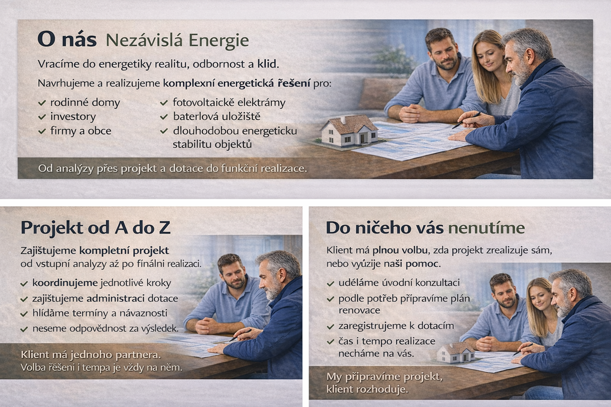 Nezávislá Energie zajišťuje odborný návrh řešení, přípravu projektu a administraci žádostí. Rozhodnutí o poskytnutí dotace je výhradně v kompetenci příslušných orgánů.