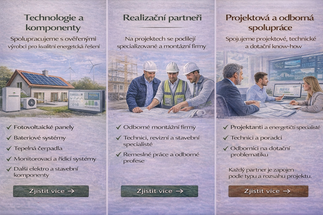 Proto spolupracujeme s prověřenými výrobci, dodavateli a odbornými partnery v jednotlivých oblastech energetiky a stavebnictví.
